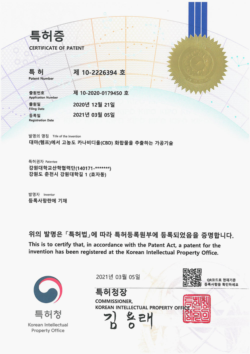 제 10-2226394호 대마(헴프)에서 고농도 카나비디올 (CBD) 화합물을 추출하는 가공 기술