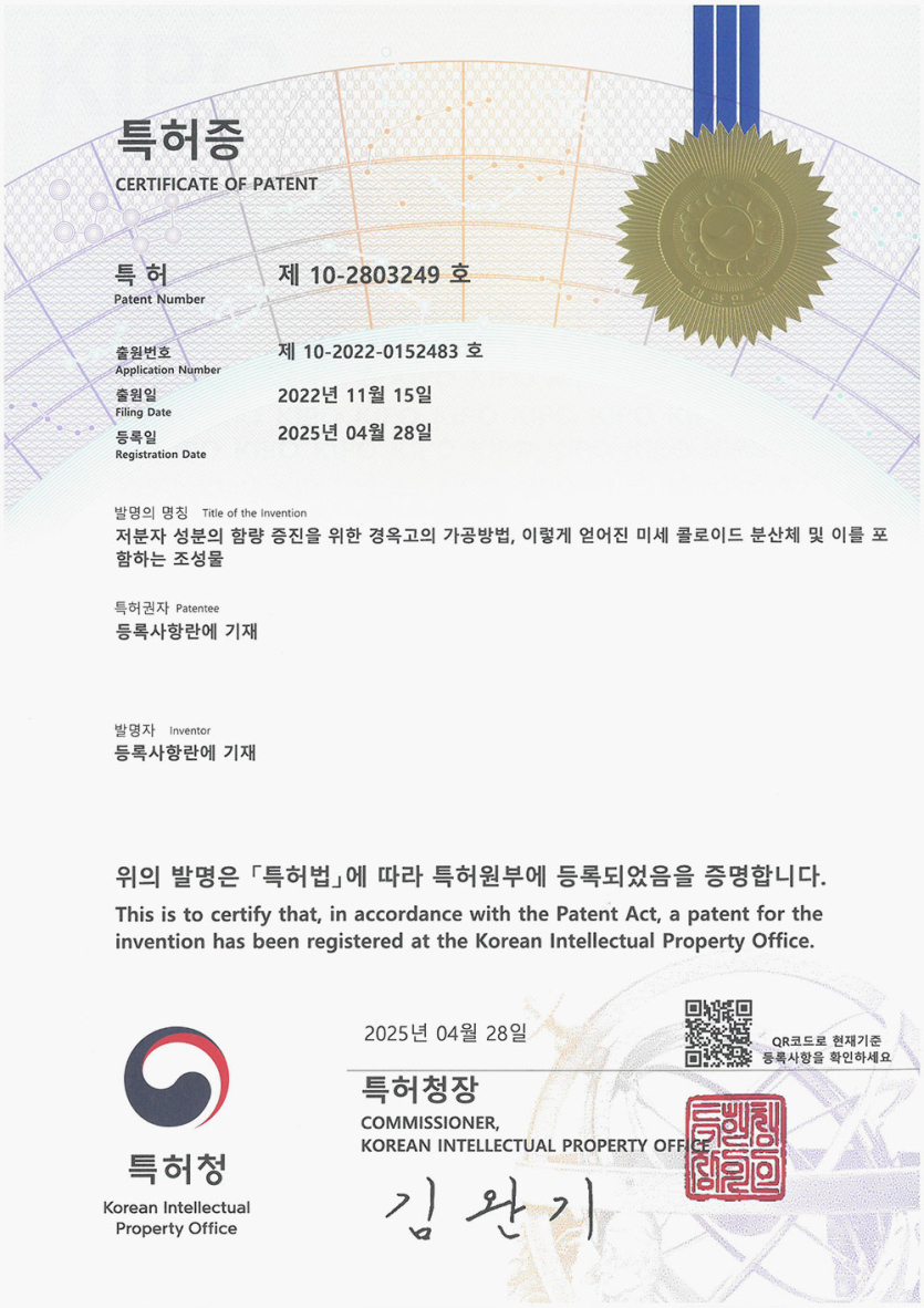 제 10-2803249호 저분자 성분의 함량 증진을 위한 경옥고의 가공방법, 이렇게 얻어진 미세 콜로이드 분산체 및 이를 포함… 페이지 정보 작성자 관리자 댓글 0건 조회 6회 작성일 25-07-21 11:40 목록 본문 제 10-2803249호 저분자 성분의 함량 증진을 위한 경옥고의 가공방법, 이렇게 얻어진 미세 콜로이드 분산체 및 이를 포함하는 조성물 이전글제 10-2814853호 HME-DDS 공법으로 처리한 하이브리드 소재와 세라마이드 리포좀을 포함하는 화장료 조성물 25.07.21 다음글제 10-2747956호 열용융 압출한 헤마토코쿠스 플루비알리스의 추출물을 유효성분으로 포함하는 패혈증의 예방, 개선 또는 치료용 조성물 25.07.21